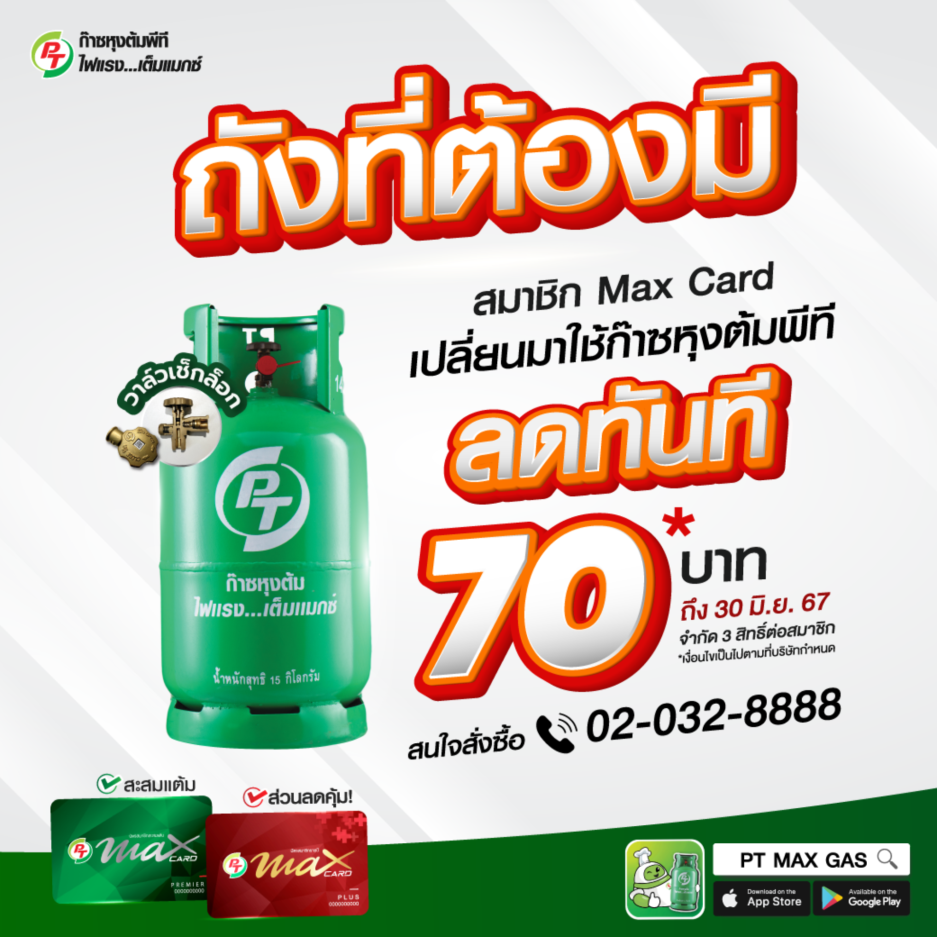 สั่งก๊าซหุงต้มพีทีผ่านแอปพลิเคชัน 'PT MAX GAS'